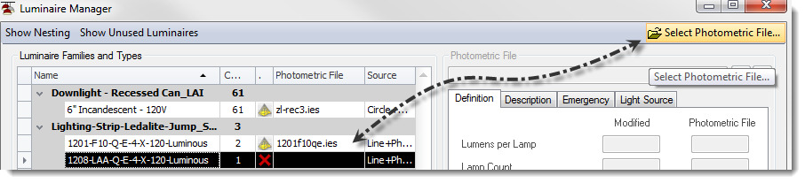 Did you know you can attach any IES photometric file to families of your own creation, or from any source? We have been surprised and somewhat dismayed to find that a number of ElumTools users, even avid ones, did not know about the “Select Photometric File” button in the Luminaire Manager. Dang it! It is completely our fault as we have sort of camouflaged it in the upper right corner in all versions of ElumTools prior to 2014.4 (just released). But no more! After AU 2013 we came home determined to make that selection stand out a bit as it offers some valuable options to ET users.